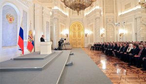 وقد صرح بوتين في بداية حقبته الثالثة أن “الأمة تحتاج إلى عقود من الاستقرار والتنمية الهادئة من دون أن يتخللها حركات حادة، أو تجارب غير مدروسة”.[45]
